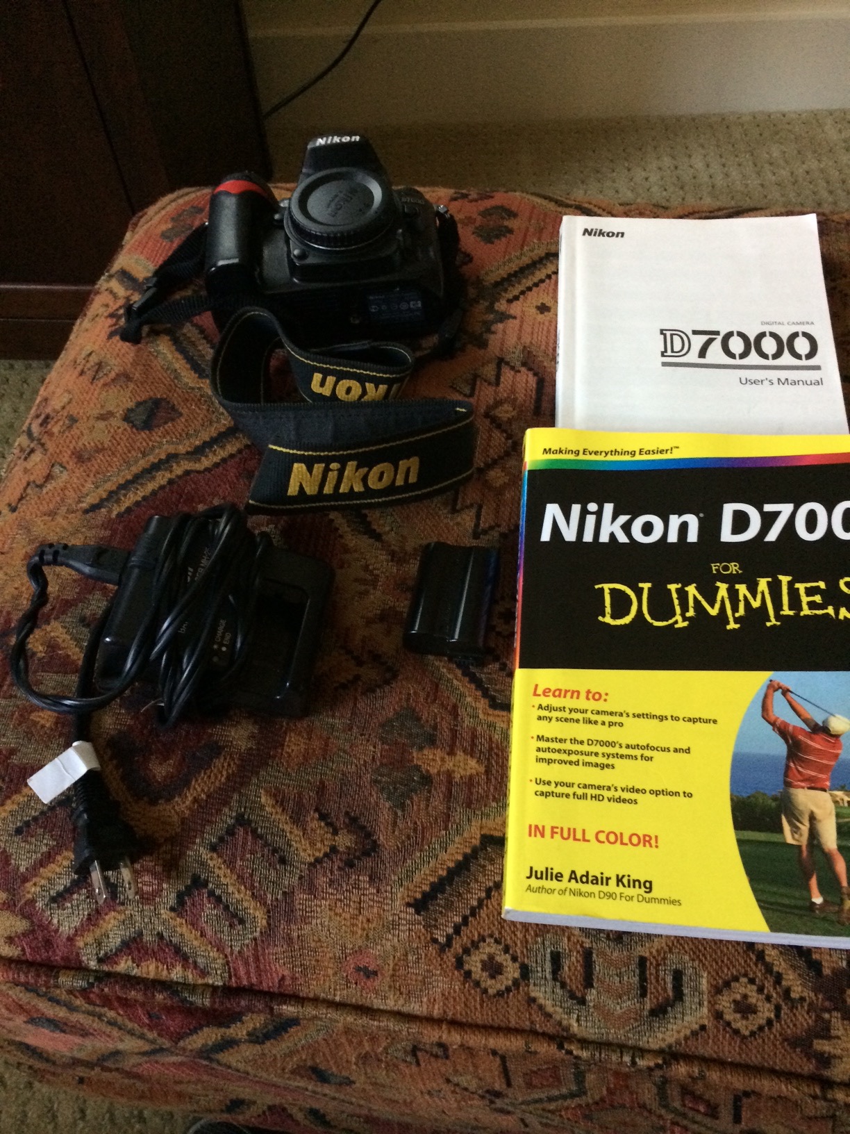 includes Nikon strap, battery, battery charger, Nikon D7000 user manual, Nikon D7000 for Dummies guide.